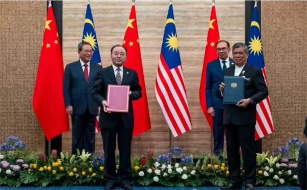 會談后,在兩位領導人的共同見證下,兩國簽署了14項合作協議和備忘錄,其中包括兩國民眾期待已久的《馬來西亞鮮食榴梿輸華植物檢疫要求議定書》,也意味著馬來西亞新鮮榴蓮可以向中國出口。簽署儀式于今天上午11時許在布城首相辦公室舉行,多位馬來西亞內閣部長和中方部長分別代表兩國簽署。