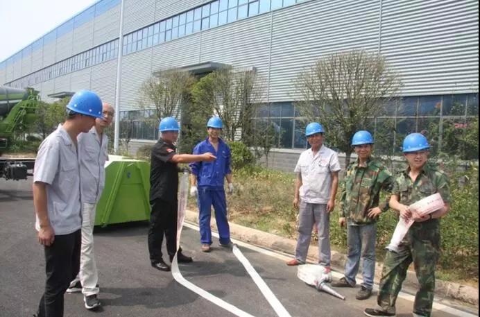 圖一:湖北程力重工總經(jīng)理胡林峰(左一)宣布消防演習(xí)正式開始,左二為常務(wù)副總李會成