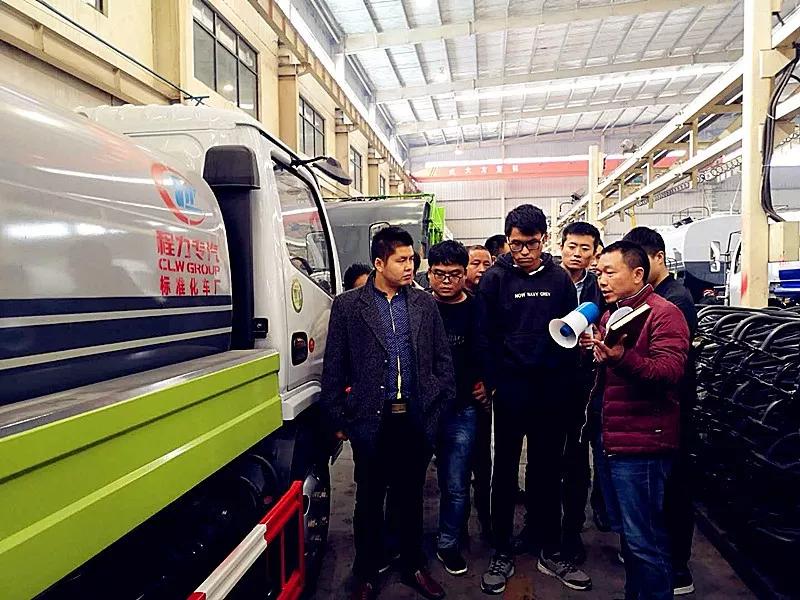 程力環(huán)衛(wèi)車(chē)標(biāo)準(zhǔn)化廠王成廠長(zhǎng)向?qū)W員們講解程力新標(biāo)準(zhǔn)水車(chē)的生產(chǎn)工藝流程。