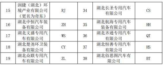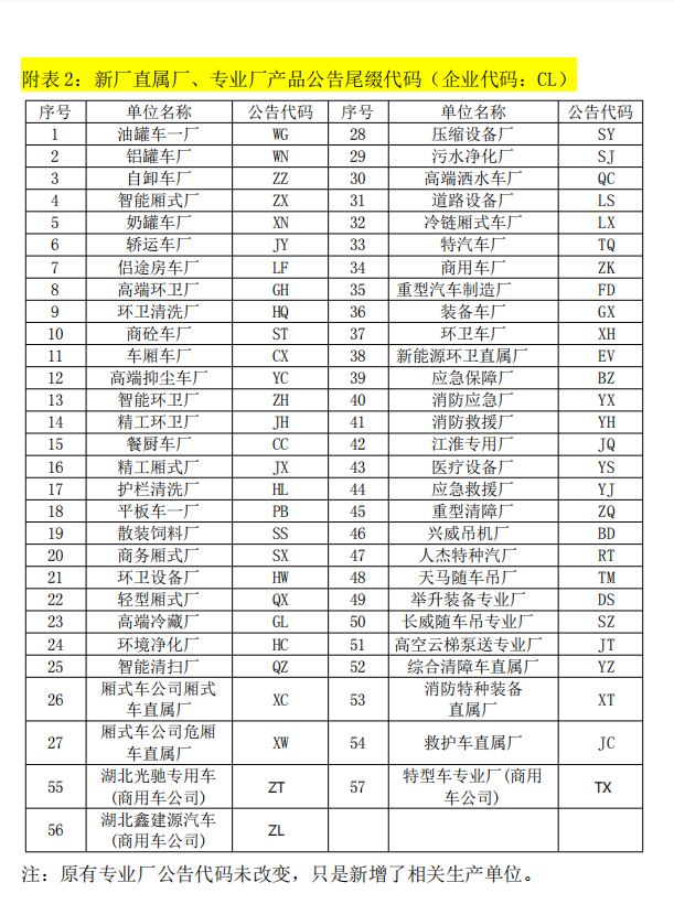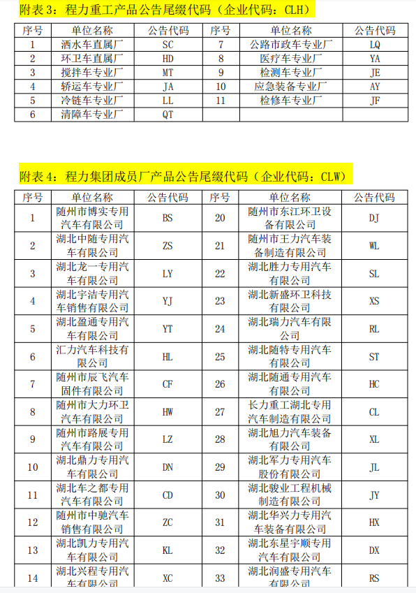 湖北程力新廠直屬廠、專業廠產品公告尾綴代碼(企業代碼:CL)