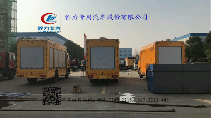 選裝配置:選裝行李架、爬梯、車頂工作臺;選裝不同形狀、結構的警示燈;選裝中隔斷(可選擇開門)、車身兩側可選開上掀門、盲窗、側開門;花紋鋁板;加裝設備工具柜、配電箱、發電機組、水泵、電焊機、空壓機等線路安裝外接電源系統、(室內燈光照明、探照燈、高桿照明燈等);繞線盤,還可根據用戶不同需求加裝不同的維修搶險設備、車身制作專用圖案或標識。