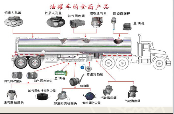 (1)海底閥:又稱緊急切斷閥,安裝于罐體底部,進(jìn)行下裝加油時(shí)使用,在油罐發(fā)生意外時(shí),由于斷槽處于無法承載過大沖力,車體管路與罐體會(huì)自動(dòng)斷開,而自動(dòng)對(duì)中柱塞和耐用彈簧會(huì)依舊保持密封,罐內(nèi)介質(zhì)不會(huì)泄漏,從而保證油罐安全。 (2)油氣回系統(tǒng):①油氣回收閥:是將在裝卸油料時(shí)所產(chǎn)生的油氣回收的一種裝置,可以直接安裝在油罐車頂部罐體上,避免了油氣外泄。 ②油氣回收接頭:罐車油氣回收系統(tǒng)組成一個(gè)封閉的循環(huán)系統(tǒng),有效的將在油站加油過程中產(chǎn)生的油氣回收再利用,避免了油氣擴(kuò)散